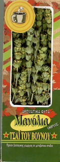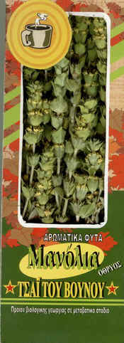 The biological products mountain tea and oregano are packaged in rectangle parallelepiped paper  boxer 28x10x4 with gelatin wrapping. The content is 40 gr. The products are placed there, after their natural drying up. It’ s noteworthy that they haven’ t been processed. Concerning the organoleptic features of mountain tea, Coedam mentions that the aroma during its preparation (boiling   lightly a few shoots of tea ) is due to the volatile ingredients of oil which are released relatively early, while substances -like flavonoedi - are transferred gradually to the water, giving to the drink its distinctive colour.  There’ s also an important difference between black tea and mountain tea;  black tea owes its aroma and flavour   to the stages of processing, in contrast to the drink of  “siderites” which almost maintains the aroma of the plant itself  since there has been no fermentation or other alteration apart from its drying up.